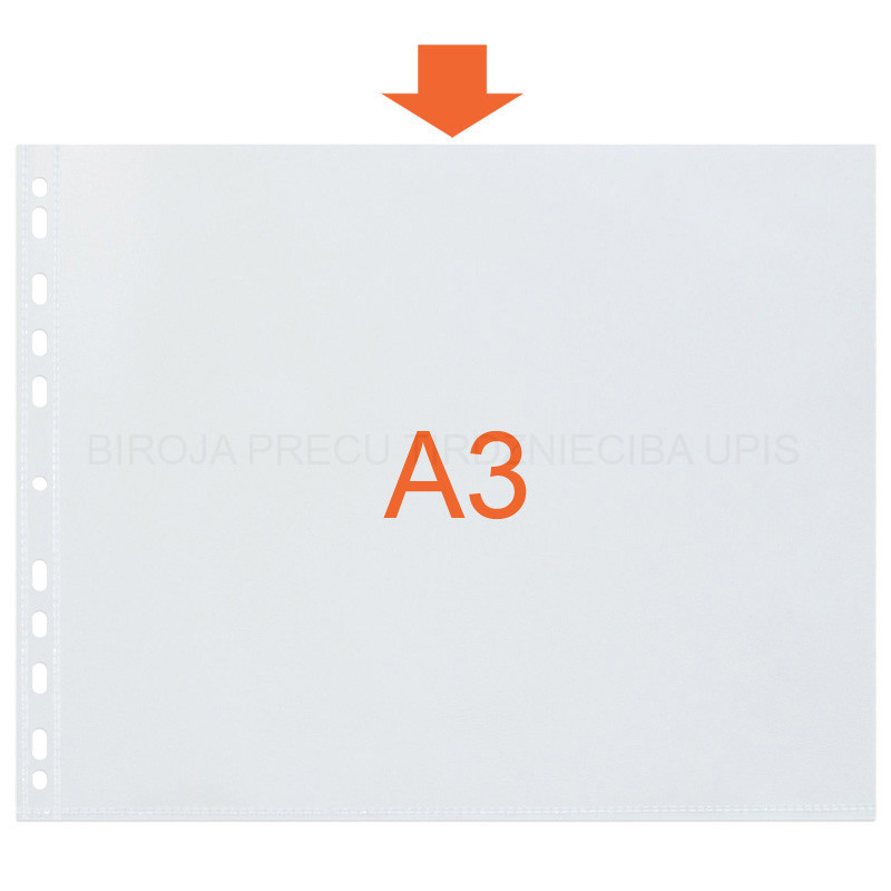 This A3 punched pocket, in A3 landscape format is perfect to present and keep plans and big format documents. Its embossed finish is stain free and anti reflective; and its high quality material allows better protection. It is clear and it is equipped with a white reinforcement strip. It is made in France and it can contain 25 sheets. The documents insert in the pocket, at the top.