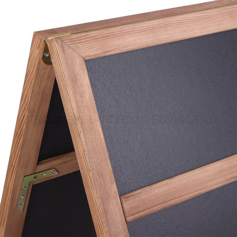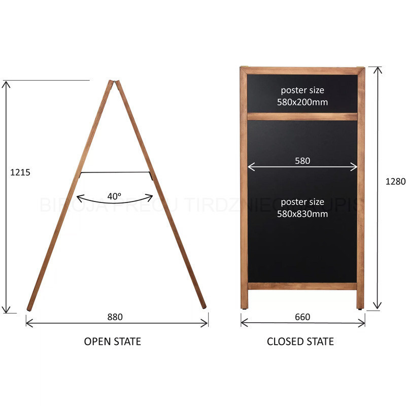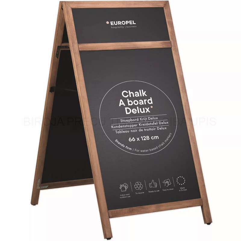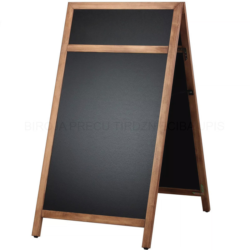 Chalk A board with a pine made frame, natural finish. With a header for your logo. Suitable for outdoor use. Sturdy finished, rounded and mitered wooden frame, fitted with a chalkboard made of wood fiber composite, very strong and weather resistant, suitable for water-based chalk markers. (Not for blackboard chalk) Easy to clean. Two-sided presentation. Equipped with protective feet under the uprights. This is to prevent damage and moisture. Dimension: 660x1280mm.