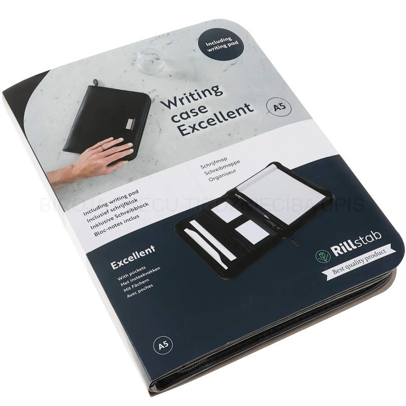 Notebook Excellent the luxury A5 is made of leather-look material. On the left inside various inserts for business cards and A5 documents, one of which can be closed with zipper. In the middle a ballpoint holder. On the right inside an A5 25 sheet lined notepad. The folder is lockable with a zipper. Metal image on the outside on which a text / logo can be applied by laser engraving. Dimensions 20 (width) x 25 (height) cm. Color black. color black.