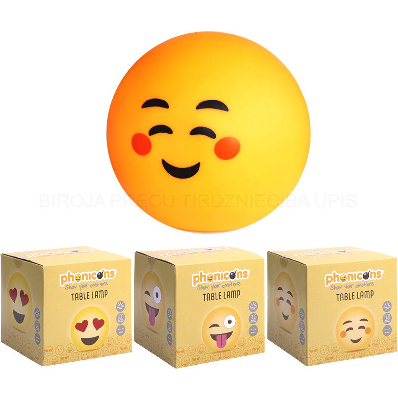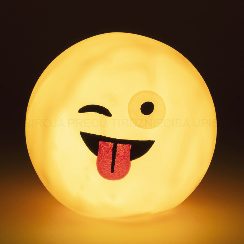 Funny faces table lamp with LED light and a warm white glow. Requires 3 AA batteries (not included). Diameter approximately 14.5 cm. Comes in assorted colors. Suitable for children ages 4 and up