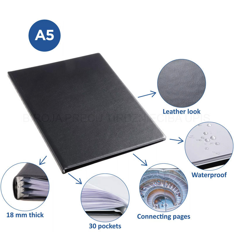 Rillstab display book A5 original made of grained plastic material. Inside, is the Rillstab mechanism, with internal pockets A5 size made from acid-free polypropylene. The internal pockets are made of polypropylene material, glass clear, non-reflecting, thickness 50 mu. On the right inside vertical insert on full height. Colour black. Space and weight-saving compared to other presentation maps and ring binders. Turn over the pages like a book.