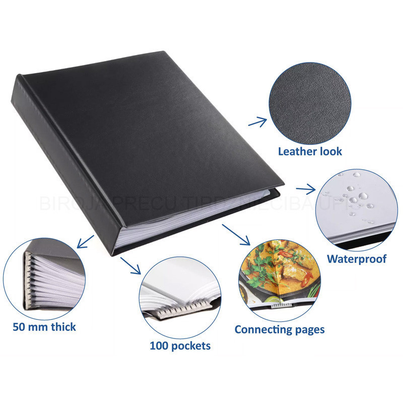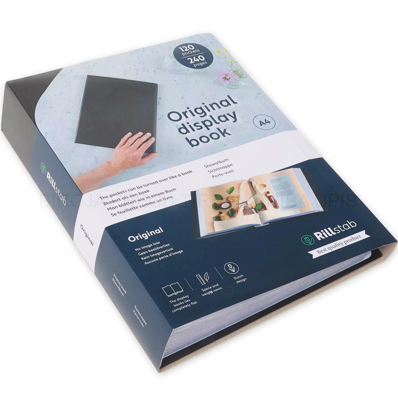 Rillstab display book A4 original made of grained plastic material. Inside, is the Rillstab mechanism, with internal pockets A4 size made from acid-free polypropylene. The internal pockets are made of polypropylene material, glass clear, non-reflecting, thickness 50 mu. On the right inside vertical insert on full height. Colour black. Space and weight-saving compared to other presentation maps and ring binders. Turn over the pages like a book.