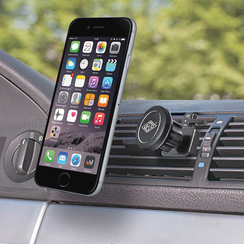 The smart holder for all 4 "- 6.0" smartphones with free adjustable viewing angle thanks to a 360 °- ball joint! Quick to install - the rubber plug with toggle switch is adjustable in 2 steps (1.5 - 3.5 mm - 2.5 mm and 2.5) depending on the thickness of the ventilation louvers, and therefore ensuring a safe and stable fixation of the smartphone holder. The strong magnet with a soft-touch surface holds all smartphone in the desired position. All functions of the Smartphones are freely accessible, even charging while driving with a USB car charger is possible. To fix the metal plate on the smartphone or hardcase three options are available: rectangular - without glue - for insertion into the sleeve; round, self-adhesive, for the back of the smartphone; round gel pad with strong adhesion for residue-free removal. The adhesive strength of the gel pads can be restored by cleaning under running water (don't dry or wipe surface). Size: Ø 38 mm, length 60 mm. colour: black. Delivery in attractive display with 6 pieces in single self-service packaging. Important Note: for use with Samsung S4 S4 Mini: the metal plate supplied has to be mounted as far away as possible from the hall sensor element of the phone. This prevents that the S4 responds to the magnetic holder and switches to standby mode.