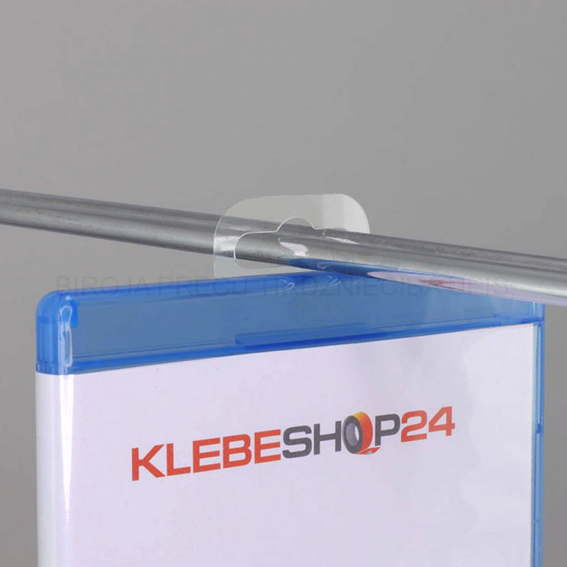 Clear Self-Adhesive Hooks, adhesive area 50x35 mm, oval hole and white reinforced header, for subsequent fitting of packages, boxes, bags for hang up on perforted selling walls.