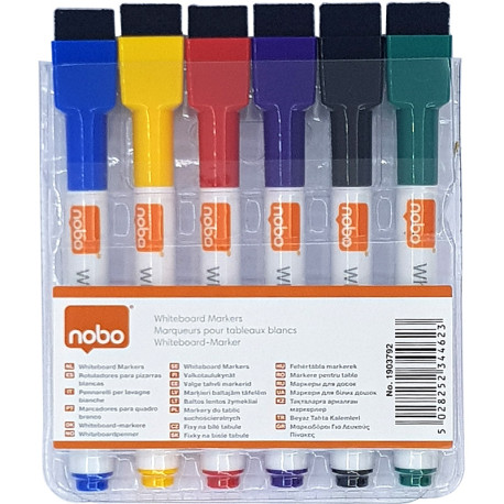 These non-permanent whiteboard markers offer great visibility on non-porous surfaces and has an integrated eraser in the magnetic whiteboard pen cap. With non toxic low odour ink, they meet all your needs; ideal for home & home office use. Pack of 6 assorted colours dry wipe pens with a 2mm width fine tip for consistent smooth lines. Use with a Nobo whiteboards for optimum performance.