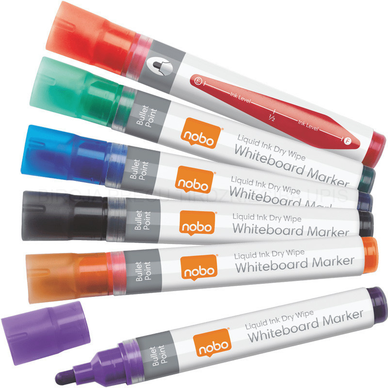 These everyday non-permanent whiteboard markers are highly versatile for use on non-porous surfaces such as whiteboards, glass and enamel. They are fast drying and can be removed easily using a dry cloth. These liquid ink pens also have a handy reservoir window showing ink levels so you never run out at a crucial moment. Available in a choice of colours to meet all your presentation needs; ideal for schools, offices and at home. Pack of 12 dry wipe pens with a bullet tip 3mm for consistent smooth lines. Use with a Nobo whiteboard for optimum performance.