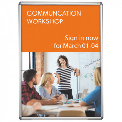 Plakātu, ziņojumu, sludinājumu utt. izstādīšanai. Viegla informācijas nomaiņa atlokot rāmja malas. Formāts A4 – A0, alumīnija rāmis, PVH aizsargplēve
