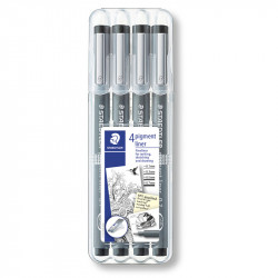 Rasēšanai, zīmēšanai un rakstīšanai, 4 līniju platumi (0.1, 0.3, 0.5, 0.7 mm), Staedtler patentētais penālis, flomāstera gals metāla apvalkā, neizbalojoša melna pigmenta tinte