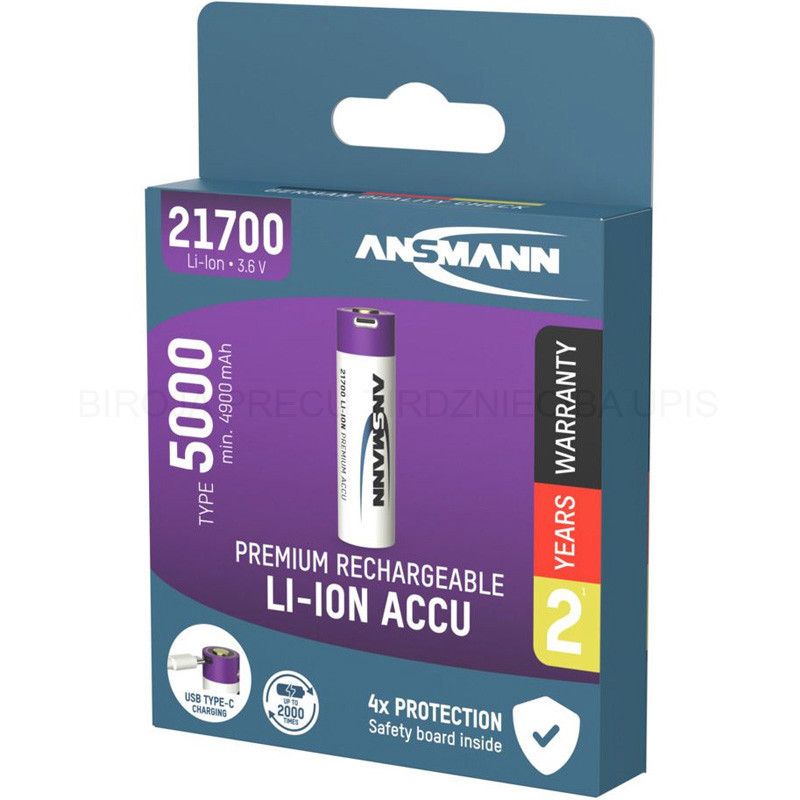 ANSMANN 21700 Li-Ion akumulators ir ārkārtīgi ilgs kalpošanas laiks, un to var uzlādēt līdz 2000 reizēm pat smagos darbības apstākļos. Ar ļoti zemu pašizlādes līmeni akumulators ilgstoši saglabā savu enerģiju pat tad, ja to neizmanto. Jaudas un svara attiecība ir daudz labāka nekā citām akumulatoru tehnoloģijām (piemēram, NiCD/NiMH/PB), jo litijs ir daudz vieglāks.