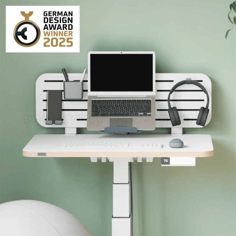 Unikālais klēpjdatora turētājs (līdz 15 collu klēpjdatoram ar maksimālo dziļumu 245 mm) viegli ievietojas perforētajā dēlī un paceļ klēpjdatora ekrānu perfektā ergonomiskā augstumā ar 2 augstuma iestatījumiem (194 mm vai 235 mm); palielina komfortu un palīdz novērst kakla vai muguras sāpes, strādājot sēdus vai stāvus, pozitīvi ietekmējot labsajūtu.